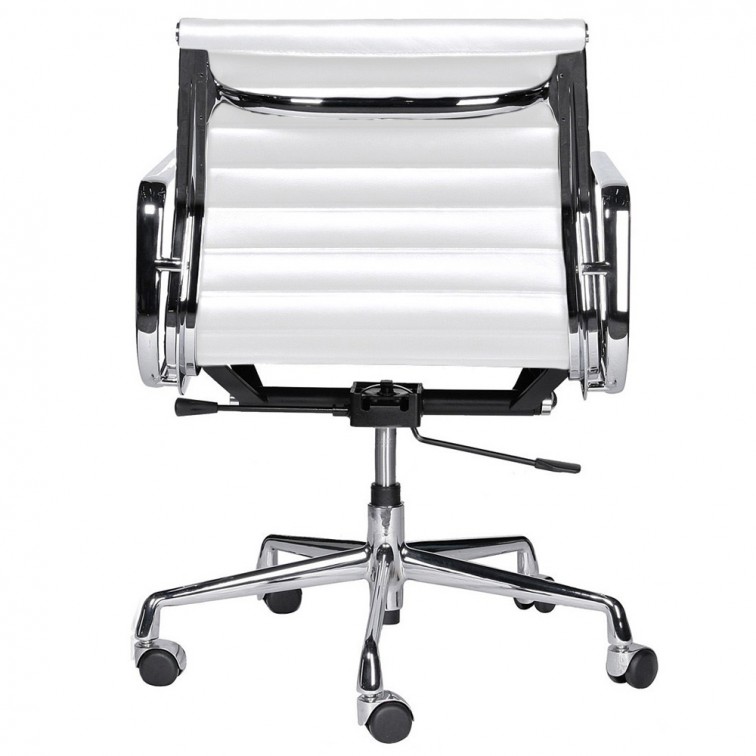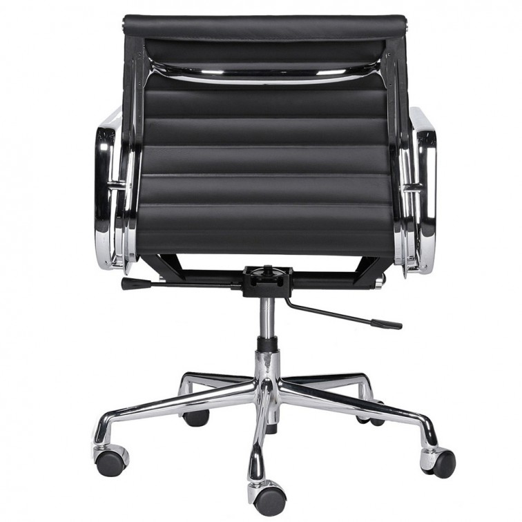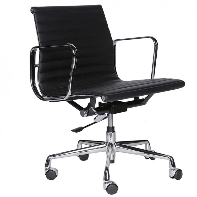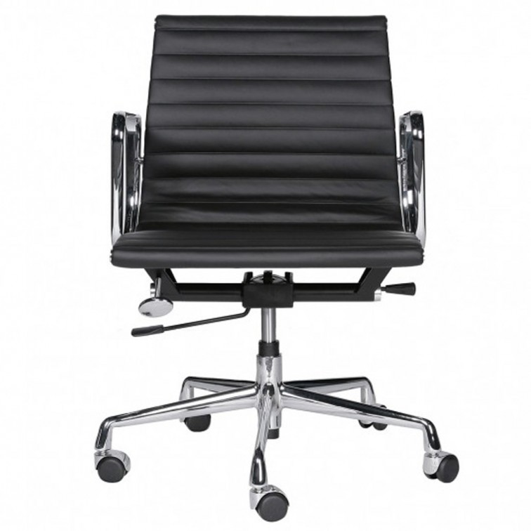 Design bureaustoel bekleed met hoogwaardig leer. Draaibare verchroomde aluminium structuur. Zeer comfortabel klassiek en eigentijds ontwerp. Het kan worden gemonteerd met rubberen wielen of massieve blokken voor parket. De hoogte is verstelbaar. Kan permanent worden geïnstalleerd. Ideaal voor grote kantoren, uitvoerende medewerkers en managementfuncties. Vergelijkbaar met de bekende design aluminium stoel.