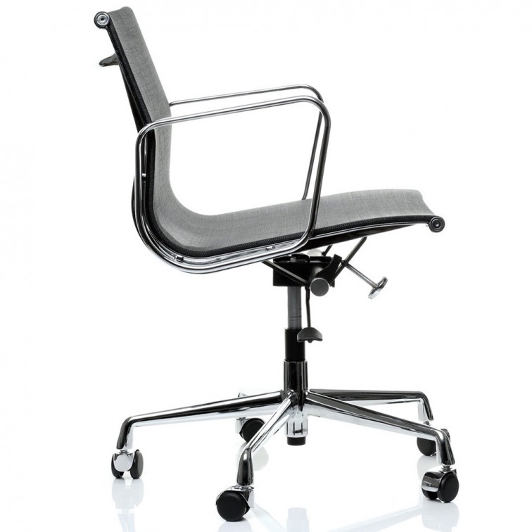 Designer-Bürostuhl mit hochwertigem Netzgewebe bezogen. Schwenkbare verchromte Aluminiumstruktur. Sehr komfortables klassisches und zeitgemäßes Design. Es kann mit Gummirädern oder festen Blöcken für Parkett montiert werden. Die Höhe ist einstellbar. Kann fest montiert werden. Ideal für große Büros, eitende Angestellte und Führungspositionen. Ähnlich dem berühmten Design Aluminium Chair.